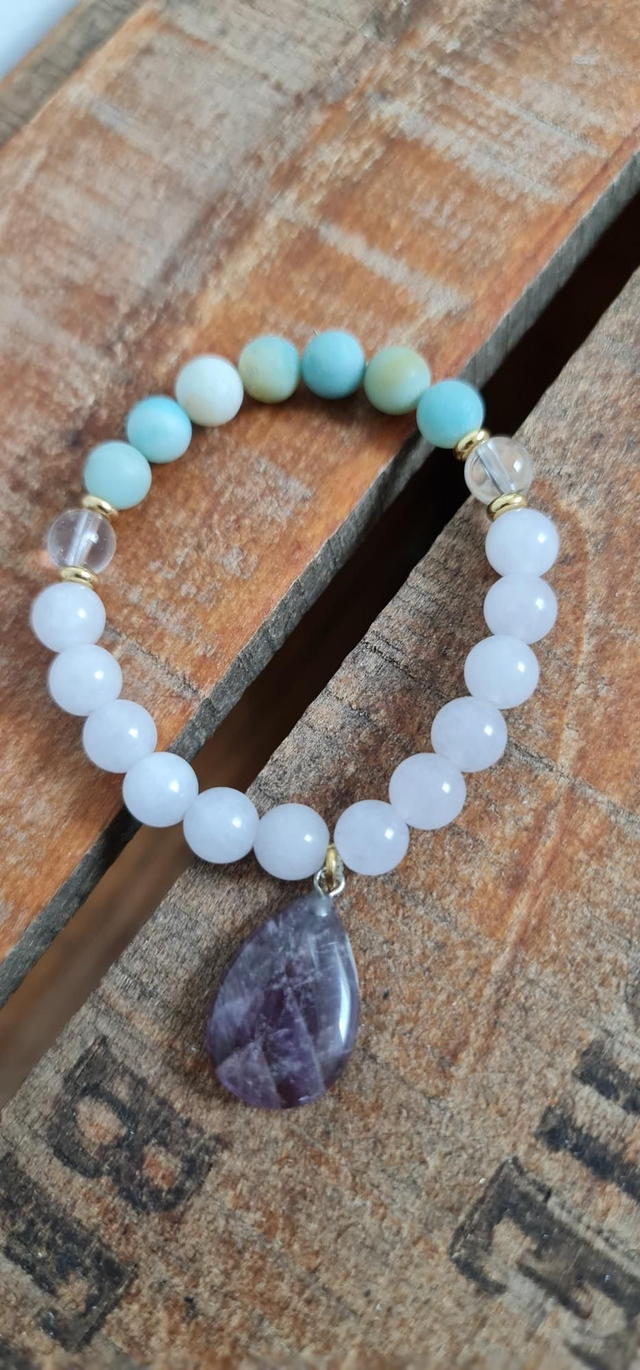 Ce bracelet favorise une énergie paisible, idéale pour apaiser les émotions, libérer la parole du cœur et t’accompagner sur ton chemin spirituel.